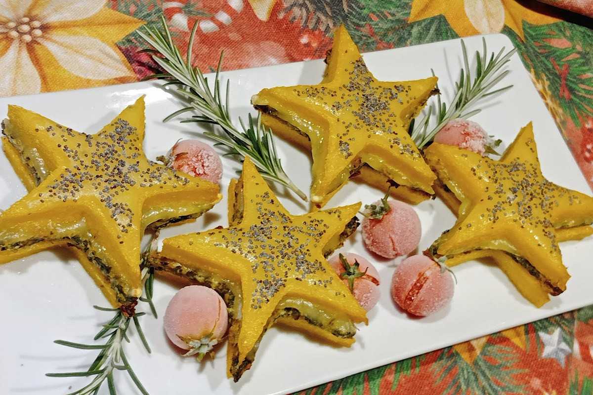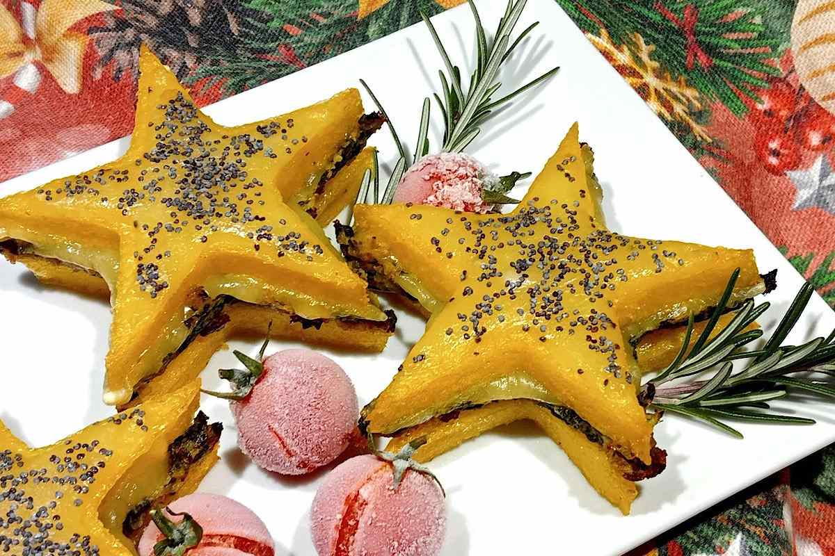 - Ricavare delle stelle più piccole dal formaggio filante e sovrapporlo al resto una volta cotto, spolverando con semi di papavero.