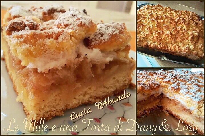 EICETTA DI: LUCIA D’ABUNDO Ingredienti: Per la frolla: 500 g di farina 00 100 g di zucchero 4 tuorli 125 g di burro 200 g di panna acida 10 g di lievito x dolci 1 pizz di sale Per lo strato di mele: 1kg di mele Fuji sbucciate e tagliate sottilissime 40 g di zucchero di canna 2 cucchiai di pan grattato Per la meringa: 4 albumi 65 g di zucchero a velo Preparazione: Lavorare la frolla, mettendo tutti gli ingredienti insieme “il burro deve essere morbido” e lasciarla riposare. Nel frattempo mettere in una pentola, sul fuoco le mele e mezzo cucchiaio di cannella con un pò di zenzero, grattugiato insieme con il pan grattato e lo zucchero. Lasciarle andare a fuoco medio, fino a che risultano asciutte e morbide. Preriscaldare il forno a 180°. Stendere una parte della pasta frolla in un rettangolo 30 x 20 cm e adagiarlo in uno stampo foderato con carta forno, mettere in forno x 25 min. Intanto montare la meringa. C